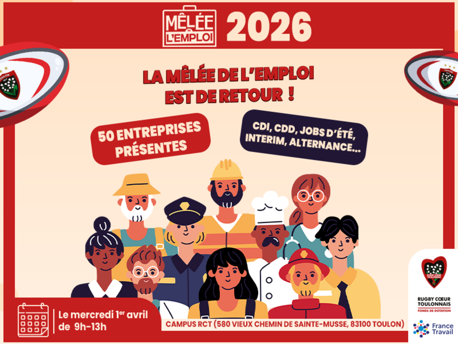 Le CDG83 participera à La Mêlée de l’Emploi, organisée par le Fonds de Dotation du Rugby Cœur Toulonnais et France Travail, le 1er avril au Campus du RCT. Cet événement a pour objectif de favoriser des rencontres de qualité entre recruteurs et candidats, afin de faire correspondre au mieux les profils aux besoins des employeurs. Un dispositif d’immersion professionnelle, PASS IMMERSION, sera également proposé pour encourager des mises en situation concrètes et faciliter les engagements professionnels.